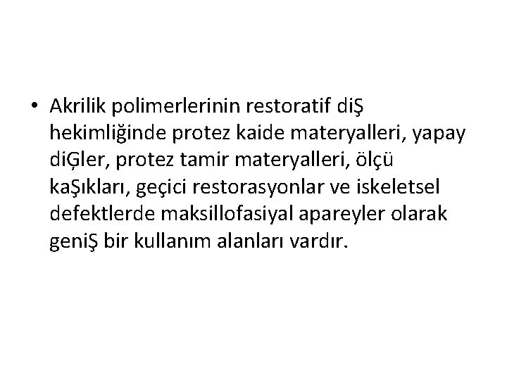 • Akrilik polimerlerinin restoratif diŞ hekimliğinde protez kaide materyalleri, yapay diĢler, protez tamir materyalleri, ölçü kaŞıkları, geçici restorasyonlar ve iskeletsel defektlerde maksillofasiyal apareyler olarak geniŞ bir kullanım alanları vardır.