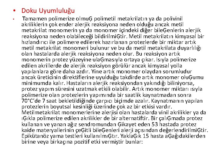 • Doku Uyumluluğu • Tamamen polimerize olmuĢ polimetil metakrilatın ya da polivinil akriliklerin çok ender alerjik reaksiyona neden olduğu ancak metil metakrilat monomerin ya da monomer içindeki diğer bileĢenlerin alerjik reaksiyona neden olabileceği bildirilmiĢtir. Metil metakrilatın kimyasal bir hızlandırıcı ile polimere edilerek hazırlanan protezlerde bir miktar artık metil metakrilat monomeri bulunur ve bu da metil metakrilata duyarlılığı olan hastalarda alerjik reaksiyona neden olur. Bu reaksiyon artık monomerin protez yüzeyine ulaĢmasıyla ortaya çıkar. Isıyla polimerize edilen akrillerde de alerjik reaksiyon görülür ancak kimyasal yolla yapılanlara göre daha azdır. Yine artık monomer olaydan sorumludur ancak üreticinin direktiflerine uyulduğu takdirde artık monomer oluĢumu minimumda kalır. Hastaların alerjik reaksiyondan yakındığı biliniyorsa, protez yapım süresini uzatmak etkili olabilir. Artık monomer miktarı ısıyla polimerize olan protezlerin yapımında bir saatlik kaynatmadan sonra 70°C’de 7 saat bekletildiğinde çarpıcı biçimde azalır. Kaynatmanın yapılan protezlerin boyutsal kesinliği üzerinde çok az bir etkisi vardır. Metilmetakrilat monomerlerine alerjisi olan hastalarda vinil akrilikler ya da ıĢıkla polimerize edilen akrilikler de bir alternatiftir. Bir çalıĢmada protez kullanan ve yanan ağız sendromundan Ģikayet eden 53 hastada protez kaide materyallerinin çeĢitli bileĢenleri alerji açısından değerlendirilmiĢtir. Epikütanöz yama testleri kullanılmıĢtır. YaklaĢık 15 hasta aĢağıdakilerden birine veya birkaçına pozitif etki vermiştir bunlar:
