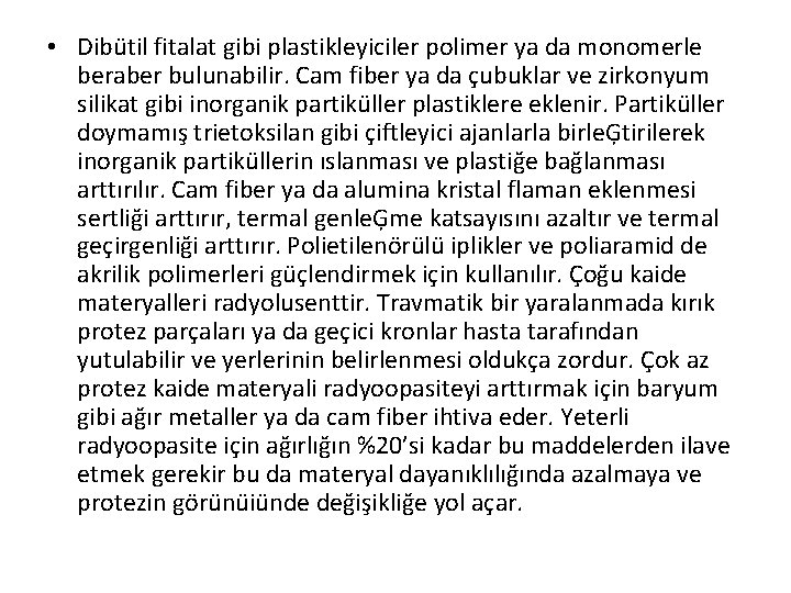 • Dibütil fitalat gibi plastikleyiciler polimer ya da monomerle beraber bulunabilir. Cam fiber ya da çubuklar ve zirkonyum silikat gibi inorganik partiküller plastiklere eklenir. Partiküller doymamış trietoksilan gibi çiftleyici ajanlarla birleĢtirilerek inorganik partiküllerin ıslanması ve plastiğe bağlanması arttırılır. Cam fiber ya da alumina kristal flaman eklenmesi sertliği arttırır, termal genleĢme katsayısını azaltır ve termal geçirgenliği arttırır. Polietilenörülü iplikler ve poliaramid de akrilik polimerleri güçlendirmek için kullanılır. Çoğu kaide materyalleri radyolusenttir. Travmatik bir yaralanmada kırık protez parçaları ya da geçici kronlar hasta tarafından yutulabilir ve yerlerinin belirlenmesi oldukça zordur. Çok az protez kaide materyali radyoopasiteyi arttırmak için baryum gibi ağır metaller ya da cam fiber ihtiva eder. Yeterli radyoopasite için ağırlığın %20’si kadar bu maddelerden ilave etmek gerekir bu da materyal dayanıklılığında azalmaya ve protezin görünüiünde değişikliğe yol açar.