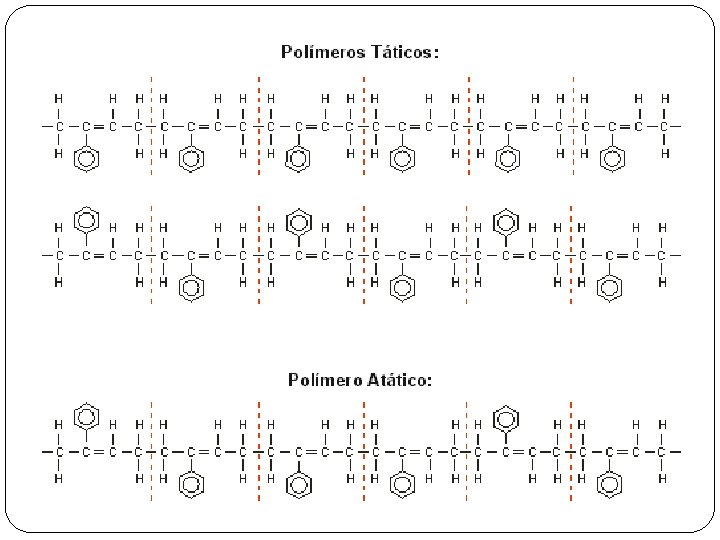 Classificação Disposição espacial dos monômeros Polímero Tático - Quando as unidades monoméricas dispõem-se ao longo da cadeia polimérica segundo certa ordem, ou seja, de maneira organizada. Isotáticos: distribuem-se ao longo da cadeia de tal modo que unidades sucessivas, após rotação e translação, podem ser exatamente superpostas; Sindiotáticos: a rotação e translação de uma unidade monomérica, em relação à seguinte, reproduz a imagem especular desta última. Polímero Atático - Quando as unidades monoméricas dispõem-se ao longo da cadeia polimérica ao caso, ou seja, de maneira desordenada.