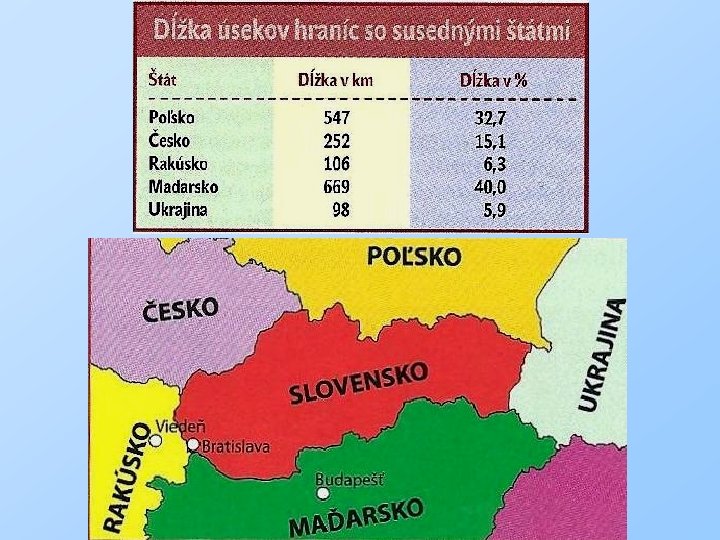 n n n n Poloha vzhľadom na okolité štáty SR susedí s 5 štátmi Štátne hranice - celkovo 1 672 km väčšinou prirodzené (75 % - vedú po riekach Morava, Dunaj, Ipeľ a po horských chrbtoch). umelé - na východe s Ukrajinou a Maďarskom. Schengenská hranica (vnútorná) – s Poľskom, Českom, Rakúskom, Maďarskom Schengenská hranica (vonkajšia) – s Ukrajinou