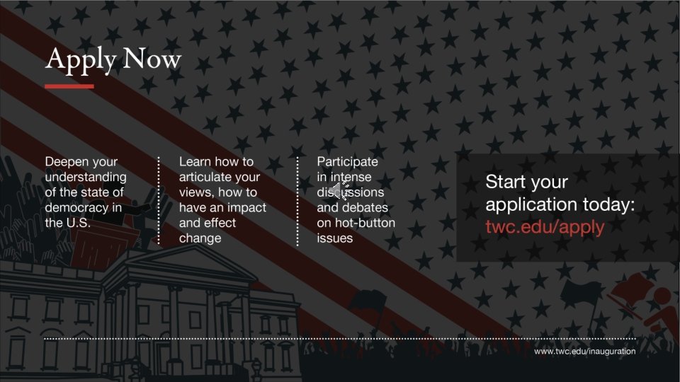 POLS 503 |803 Washington Seminar Inauguration 2021 � � Interested students will have to apply directly to TWC (see next slide) and contact Prof. Kulich (ckulichvamvakas@suffolk. edu) for more information and to obtain permission to register. Applications to TWC are due by November 11 th. The application is short and you must make sure that you indicate that you are doing the course for credit, that Prof. Kulich is your liaison / faculty leader and, if you enter the code “Faculty. Group” you will pay no application fee. An info session will be held in the next few weeks and TWC reps will make short visits to some classes.