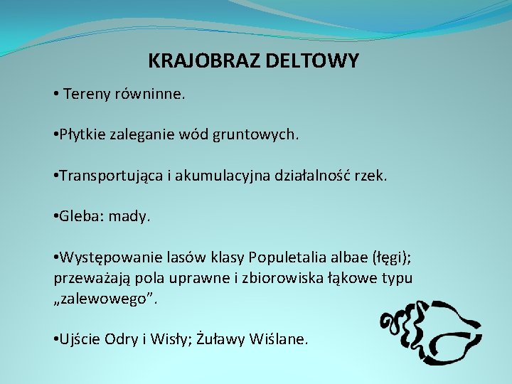KRAJOBRAZ DELTOWY • Tereny równinne. • Płytkie zaleganie wód gruntowych. • Transportująca i akumulacyjna działalność rzek. • Gleba: mady. • Występowanie lasów klasy Populetalia albae (łęgi); przeważają pola uprawne i zbiorowiska łąkowe typu „zalewowego”. • Ujście Odry i Wisły; Żuławy Wiślane.