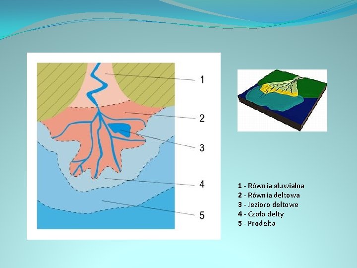 1 - Równia aluwialna 2 - Równia deltowa 3 - Jezioro deltowe 4 - Czoło delty 5 - Prodelta