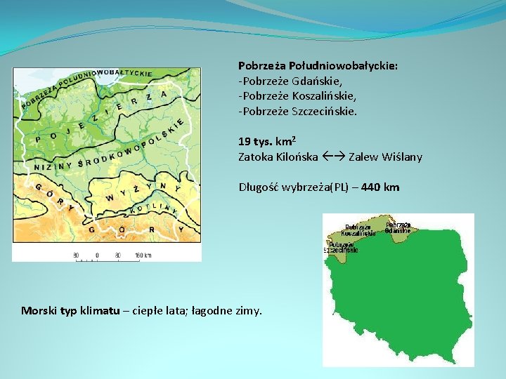 Pobrzeża Południowobałyckie: -Pobrzeże Gdańskie, -Pobrzeże Koszalińskie, -Pobrzeże Szczecińskie. 19 tys. km 2 Zatoka Kilońska Zalew Wiślany Długość wybrzeża(PL) – 440 km Morski typ klimatu – ciepłe lata; łagodne zimy.