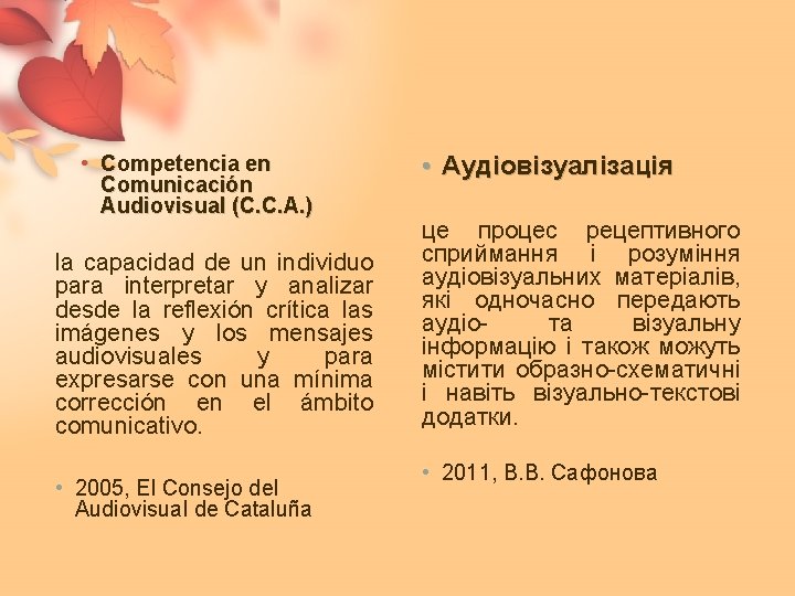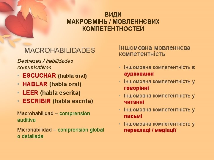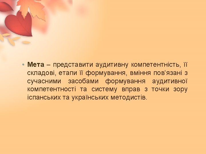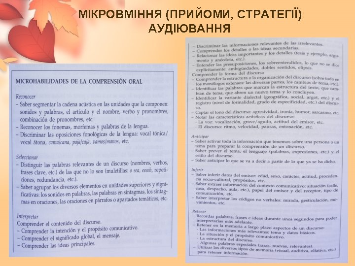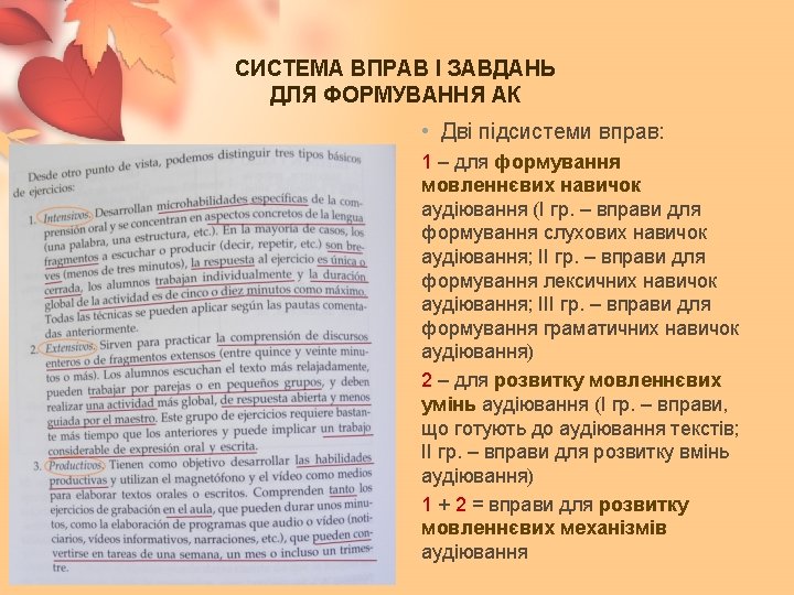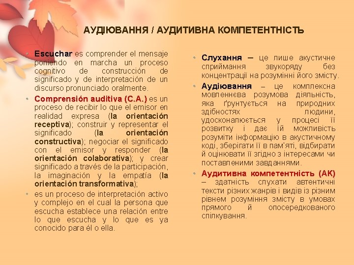 ЕТАПИ ФОРМУВАННЯ АК • Pre-escucha – activar el conocimiento previo o esquemata (schemata): escuchar una breve introducción al texto en que se podría incluir escuchar el título, la primera oración o varias frases; inferir el contenido, el vocabulario, la estructura y la organización del texto. Durante esta etapa, se despierta el interés y la curiosidad de los estudiantes por lo que van a escuchar. • Durante la escucha: entender el mensaje y determinar la idea principal, sin prestarle atención a todos los detalles examinar la información o los detalles de partes específicas incluidas en el texto, tales como escuchar el reporte del tiempo, seguir instrucciones dadas en la radio, o dar los nombres o los números etc. • Después de la escucha: opinar acerca del texto en forma oral o escrita expresando los sentimientos y actitudes al realizar actividades como guiones, entrevistas, análisis de personajes, ensayos o discusiones, entre otras. • Дотекстовий етап: організується викладачем для усунення мовних і смислових труднощів пропонованого аудіотексту; прогнозування змісту аудіотексту за його назвою, ілюстрацією, ключовими словами, першим / останнім реченням / абзацом тощо; формулювання комунікативної настанови на аудіювання; • Текстовий етап: слухання аудіотексту у контексті сформульованої комунікативної установки; • Післятекстовий етап: контроль розуміння змісту аудіотексту (невербальний; вербальний – рецептивний, репродуктивний).