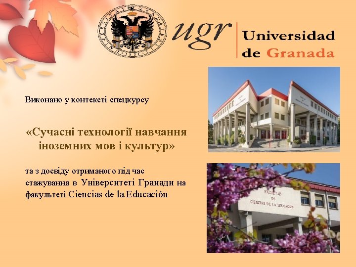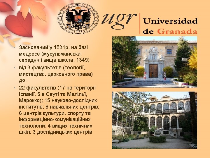 Науково-дослідні Інститути Факультети • • • • • • Facultad de Bellas Artes F. de Ciencias del Deporte F. de Ciencias Económicas y Empresariales F. de Ciencias de la Educación F. de Ciencias Políticas y Sociología F. de Ciencias de la Salud de Ceuta F. de Ciencias Sociales de Melilla F. de Ciencias del Trabajo F. de Comunicación y Documentación F. de Derecho F. de Educación, Economía y Tecnología de Ceuta F. de Educación y Humanidades de Melilla F. de Enfermería de Melilla F. de Farmacia F. de Filosofía y Letras F. de Medicina F. de Odontología F. de Psicología F. de Trabajo Social F. de Traducción e Interpretación • • • • Instituto Andaluz de Ciencia de la Tierra Inst. Andaluz de Geofísica y Prevención Desastres Sísmicos Inst. Andaluz de Interuniversitario de Criminología Inst. “Carlos I” de Física Teórica y Computacional Inst. de Biopatalogía y Medicina Regenerativa Inst. de Biotecnología Inst. Universitario de Investigación de Desarrollo Regional Inst. Universitario de Matemáticas Inst. de Neurociencias “Federico Olóriz” Inst. de Nutrición y Tecnología de Alimentos “José Mataix Verdu” Inst. del Agua Inst. Internacional de Investigación del Sistema Tierra en Andalucía Inst. de Investigación de Estudios de las Mujeres y de Género Inst. Universitario de la Paz y los Conflictos Inst. de Migraciones
