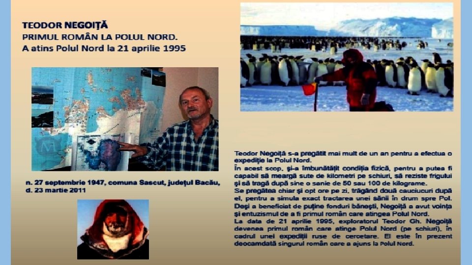 POLI NORDICI ØPolul Nord terestru este un punct geografic fix care este diametral opus Polului Sud terestru pe axa de rotaţie a planetei noastre; este partea de sus a vârfului de rotire a Pământului. ØPolul Nord Magnetic este punctul unde câmpul magnetic este perpendicular pe suprafaţa Pământului, “scufundat” adânc pentru a forma un elipsoid rotativ. ØPolul Nord Magnetic nu este staţionar. ØDesigur, Pământul are şi un Pol Magnetic Sudic, dar Polul Magnetic Nordic nu este neapărat diametral opus cu el. ØChiar acum ei sunt abătuţi cu mai mult de 20 grade latitudine. ØAtunci când săgeata compasului arată spre punctul nord, ea de fapt este îndreptată spre Polul Nordic Magnetic. ØPolul Nord magnetic mai este numit şi geomagnetic. ØDe-a lungul secolului trecut, Polul Nordic geomagnetic a migrat din Groenlanda în Canada. ØPolii geomagnetici se deplasează cu timpul, deoarece câmpul magnetic este produs de mişcarea aliajelor de fier topit din stratul extern a nucleului Pământului.