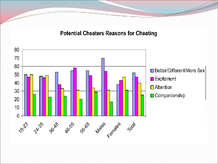 Cheating Survey Participants • Males 43% • Females 57% � 61% have been cheated on � 59% have cheated on a partner � 57 % have been a secret lover � 72% of those who have cheated have also been cheated upon
