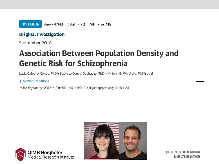 Conclusions • People with a higher genetic risk for schizophrenia may prefer to live in more urban and populated areas. • Importantly, this study does not use a case-control sample but an unselected population sample where the genetic risk for schizophrenia was estimated. • Greater genetic predisposition to schizophrenia is at least one mechanism explaining why this illness is more prevalent in city environments. • Future research should test if this effect is replicated in another countries, analyse migration effects and identify what aspects of urbanised life correlate with SCZ genetic risk.