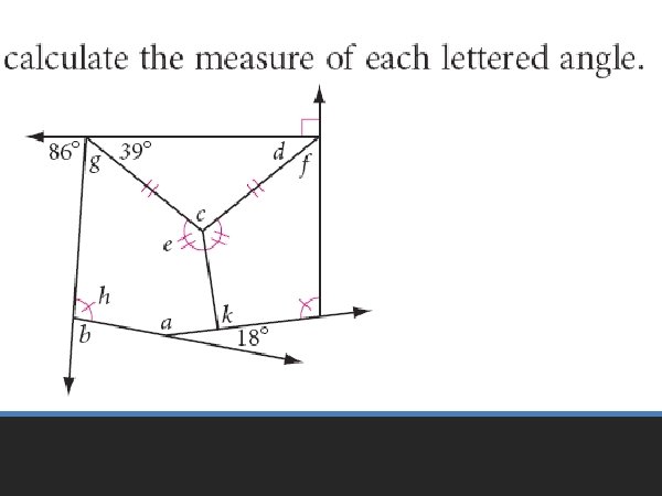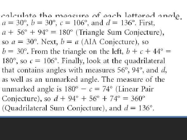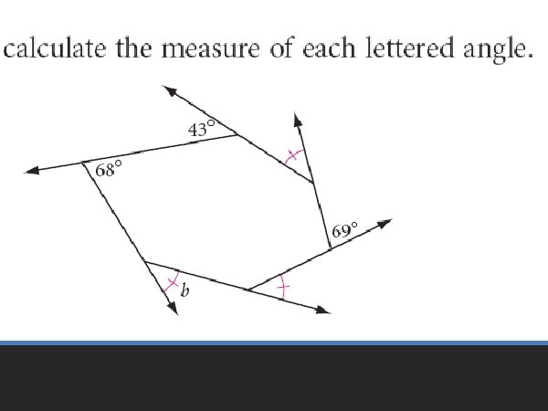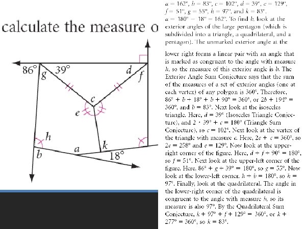 • Use the linear pair conjecture to calculate the value of each exterior angle. • Write down the value on the angle • Add up all the exterior measures Exterior Angle Investigation