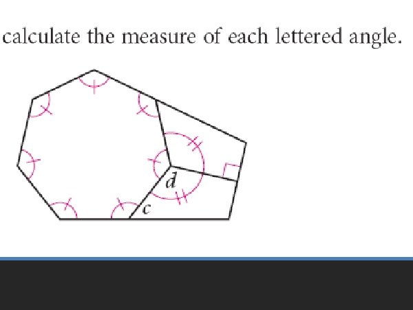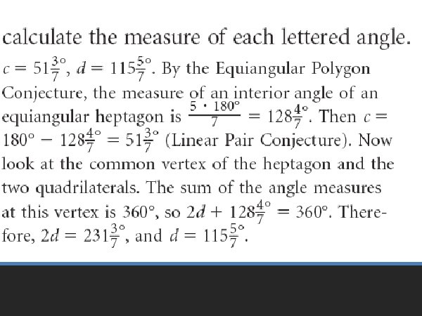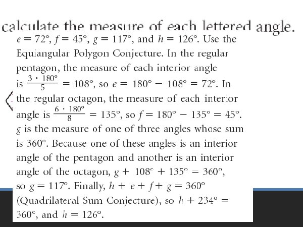 • Summarize our results Total Degrees in each polygon. Do you see a pattern? Angle Exploration Sides 3 4 5 6 7 8 9 10 11 Total 180° 360° 540° 720° 900° 1080° 1260° 1440° 1620° Degrees 60° 90° 108° 120° 129° 135° 140° 144° 147°