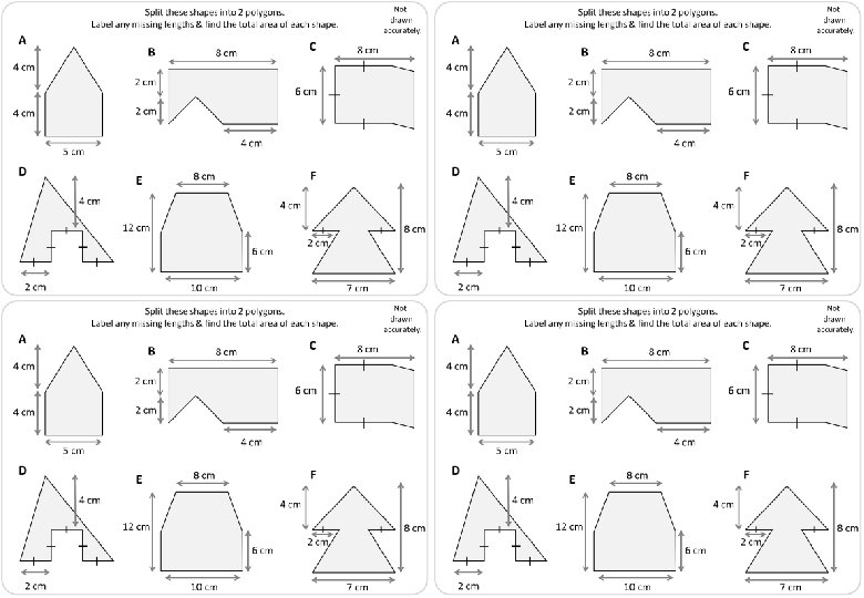 Not drawn accurately. Split these shapes into 2 polygons. Label any missing lengths & find the total area of each shape. A 4 cm 10 + 20 = 30 cm 2 B 2 cm 32 − 4 = 28 cm 2 2 cm 4 cm 5 cm D 18 − 4 = 14 cm 2 E 6 cm 4 cm 36 + 12 = 48 cm 2 2 cm F 4 cm 3 cm 12 cm 4 cm 8 cm 60 + 54 = 114 cm 2 2 cm C 8 cm 10 cm 6 cm 4 cm 20 + 14 = 34 cm 2 7 cm 8 cm