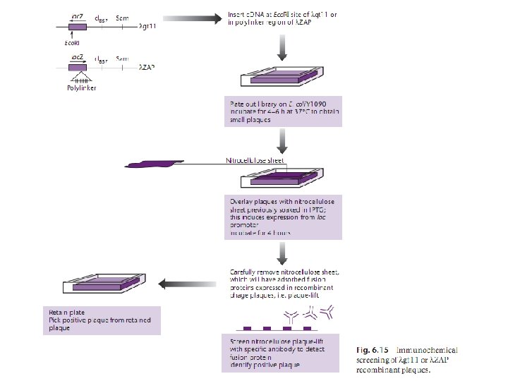 Immunological screening uses specific antibodies to detect expressed gene products