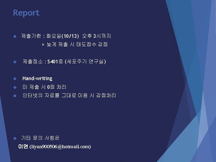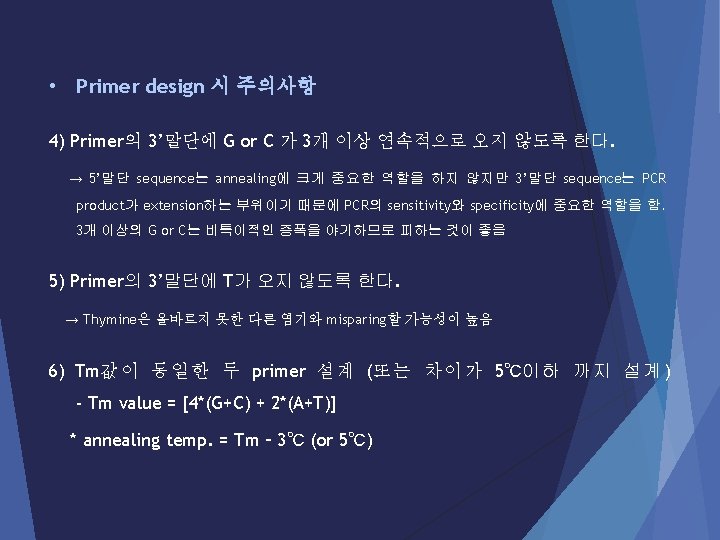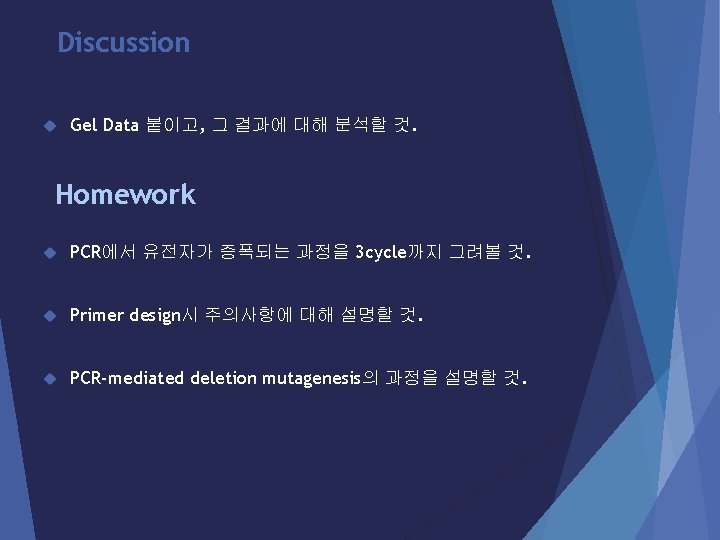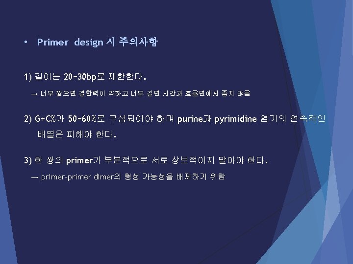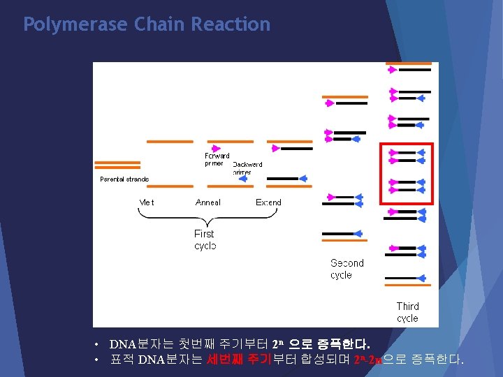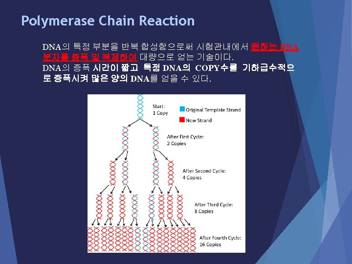 Polymerase Chain Reaction The three steps of PCR Step 1. Denaturation : 열을 가하면 DNA의 이중가닥의 수소결합이 파 괴되어 단일가닥으로 분리됩니다. Step 2. Annealing : DNA primer가 DNA 에 결합하는 단계. Step 3. Extension : DNA polymerase 에 의해 DNA 합성이 일어나는 단 계. (유의사항 : Extension time의 설정은 증폭하고자 하는 product 의 size와 사용하는 효소에 따라 달라진다. ) Herculase II: ~1 kb(30 s) Taq polymerase: ~1 kb (1 min) (25~30 cycle)