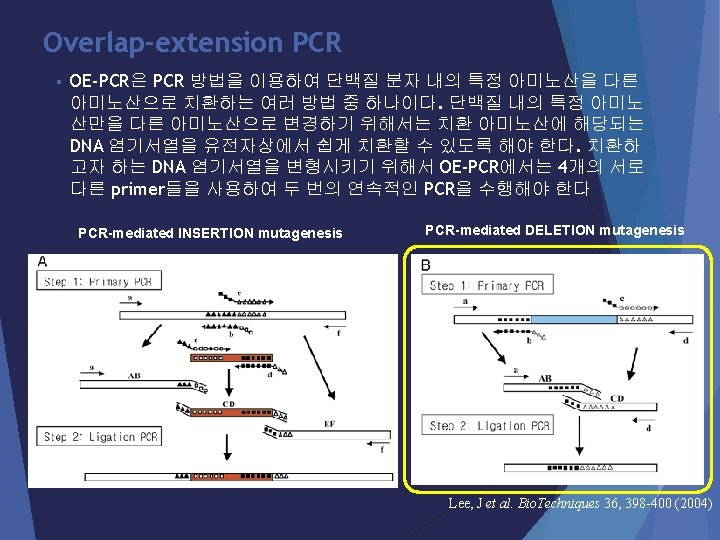 Procedure : Primary PCR • Ingredient for PCR reaction (Primary PCR) Component Quantity per reaction Targets 1 -10 kb Distilled water 35. 5 ul 5 x Herculase II reaction buffer 10 ul d. NTP mix 0. 5 ul DNA template 1 ul Primer A, B /C, D Each 1 ul/tube Herculase II fusion DNA polymerase 1 ul Total reaction volume 50 ul • Primary PCR condition Temp. (℃) Time 95 5 min 95 30 sec 55 30 sec 72 5 min 30 cycles