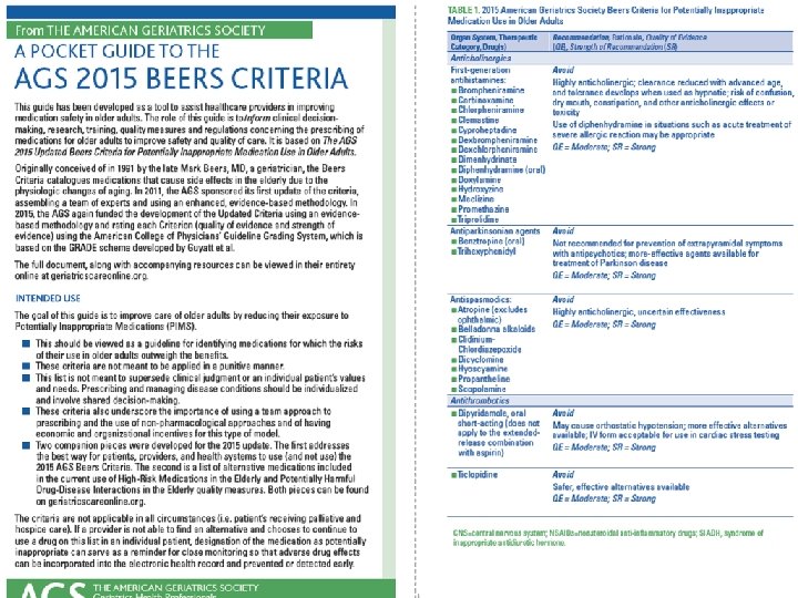 Medications to Avoid Based on Conditions Medical condition Medications to avoid if possible Falls Benzodiazepines, Z drugs, antipsychotics, TCAs, antihypertensives (ACEI, ARBs, CCB, BB, diuretics) Cognitive impairment Anticholinergic drugs, CNS-acting drugs BPH, urine retention Anticholinergic drugs, benzodiazepines, antispasmodics, TCA, 1 st gen antihistamines Bleeding disorders ASA, clopidogrel, prasugrel, ticagrelor, NSAIDs Constipation Anticholinergic drugs, opioids, CCBs Heart failure NSAIDs Renal insufficiency NSAIDs Hypertension NSAIDs Peptic ulcer NSAIDs