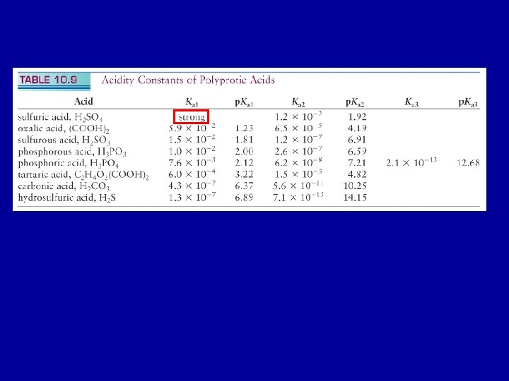 H 2 CO 3 (aq) + H 2 O(l) H 3 O+(aq) + HCO 3 -(aq) Ka 1 = 4. 3 x 10 -7 HCO 3 -(aq) + H 2 O(l) H 3 O+(aq) + CO 32 -(aq) Ka 2 = 4. 8 x 10 -11 Typically: Ka 1 >> Ka 2 >> Ka 3 >>… Harder to loose a positively charged proton from a negatively charged ion, because of attraction between opposite charges.