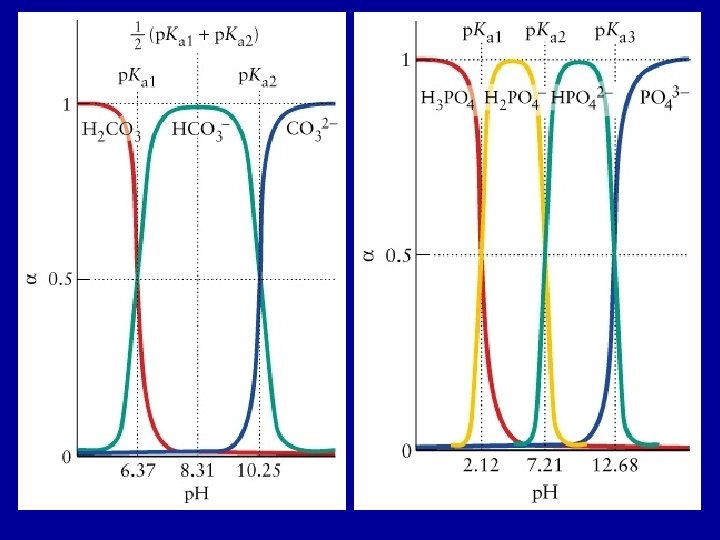 Composition and p. H For a solution of H 2 CO 3(aq): at low p. H the fully protonated species (H 2 CO 3) dominates; at high p. H the fully deprotonated form (CO 32 -) dominates; and at intermediate p. H the intermediate species (HCO 3 -) dominates. Le. Chatelier’s principle at work H 2 CO 3 (aq) + H 2 O(l) H 3 O+(aq) + HCO 3 -(aq) Ka 1 = 4. 3 x 10 -7 HCO 3 -(aq) + H 2 O(l) H 3 O+(aq) + CO 32 -(aq) Ka 2 = 4. 8 x 10 -11