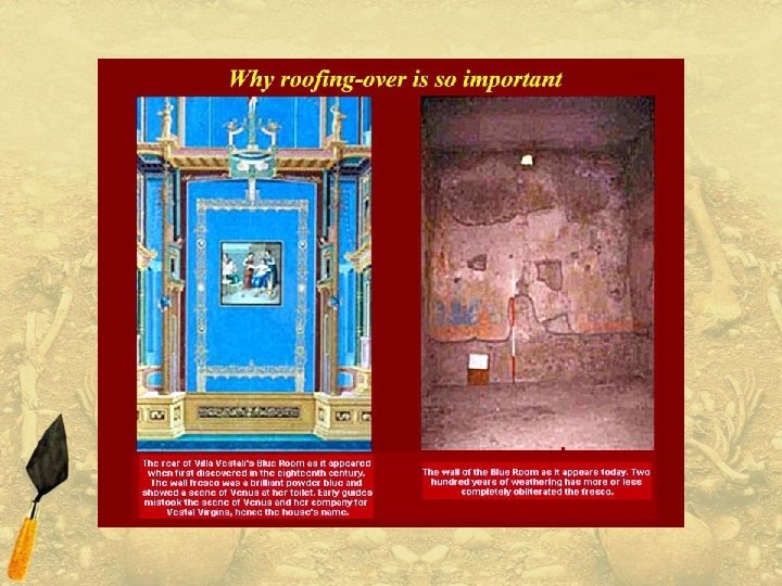 Light Exposure to painted walls, frescoes and paintings u u u Problems with wall paintings is the high calcium content which dissolves under the influence of acid rain Artists in ancient Pompeii painted the town red 2, 000 years ago with a brilliant crimson pigment that dominated many of the doomed city's wall paintings. They were protected by a protective layer of “ punic wax” Scientists now believe that a chemical reaction takes place between chlorine elements in rain and either the wax or the cinnibar to produce the blackening The wall at right shows the heavy damage due to blackening of cinnabar in the Poppea's villa in Oplontis