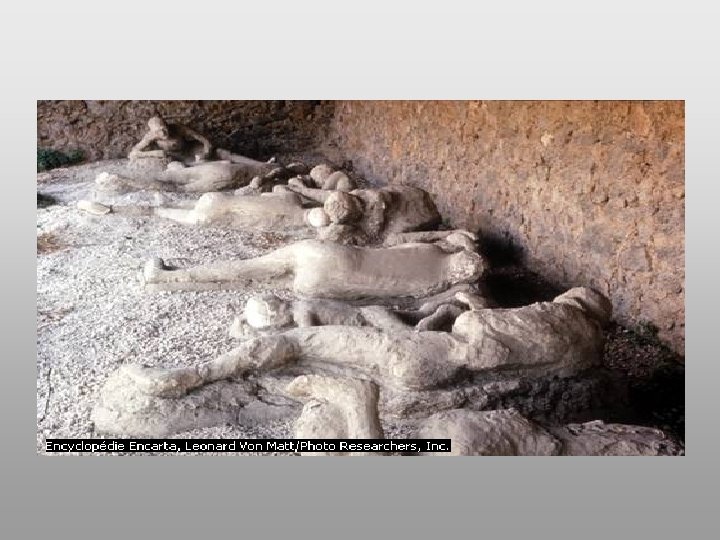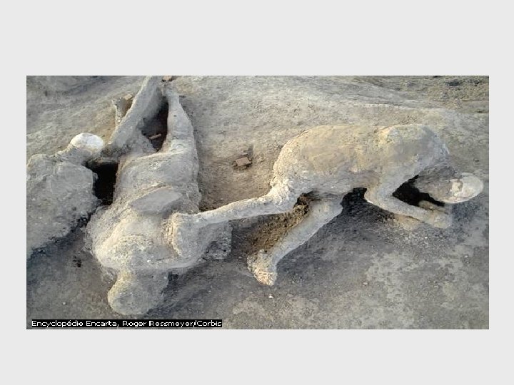 Pompéi • Pompéi est une ville italienne, victime de sa proximité au Vésuve, un volcan. • Le 24 août 79, le Vésuve entre en éruption. • Pompéi fut ensevelie sous 4 à 5 mètres de cendres ardentes. • La majorité des habitants eut le temps de fuir. • La ville voisine, Herculanum, fut détruite par une coulée de boue. • L’éruption du Vésuve causa la mort d’environ 2000 personnes. • Les savants de l’Antiquité croyaient que les éruptions volcaniques et les tremblements de terre étaient causés par des ouragans souterrains.