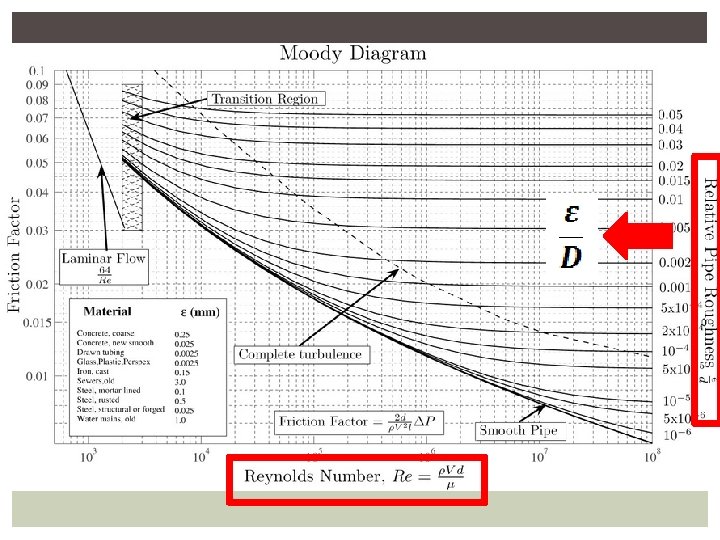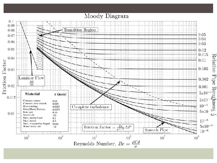 Valores da rugosidade média dos materiais empregados. TIPO DE MATERIAL e (mm) Ferro fundido novo 0, 26 – 1 Ferro fundido enferrujado 1 – 1, 5 Aço comercial 0, 046 Aço galvanizado 0, 15 Cobre ou vidro 0, 0015 Cimento bruto 1– 3 Madeira 1, 0 – 2, 5 Tijolo 5 Plástico 0, 06