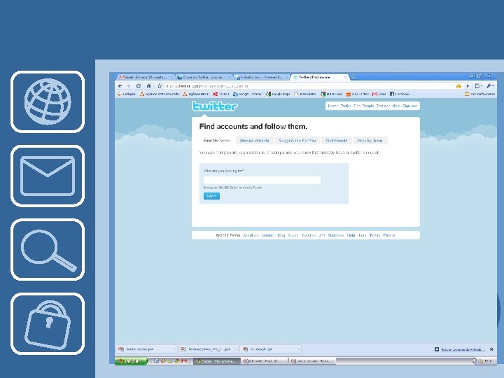 TWITTER • Rede social e servidor para microblogging que tem como objetivos: . Interação com os amigos. Discussão sobre os assuntos atuais. Compartilhar links interessantes. Marketing. Cobertura ao vivo de eventos • Endereço: – www. twitter. com