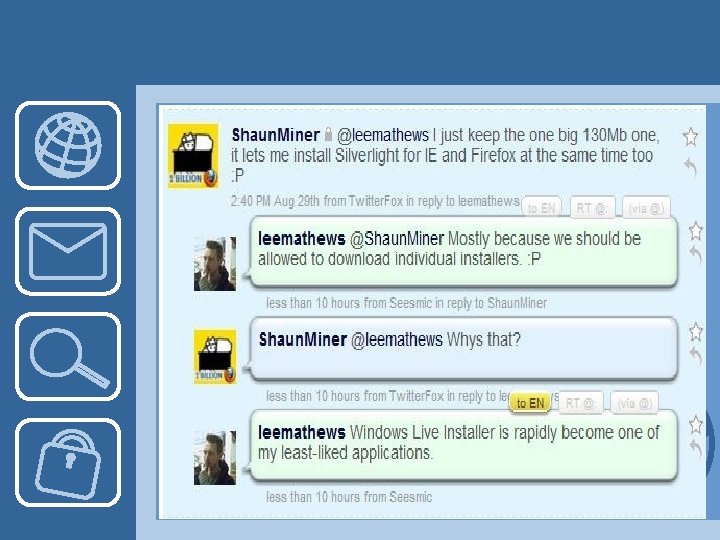 • Pbtweet. Ótimo para quem não sabe muito de inglês. Colocando o mouse sobre uma mensagem no twitter, te da 3 opções: . Traduz para o português. Manda um RT. Manda uma via da mensagem