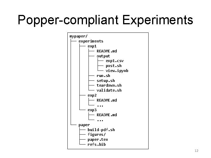 $ cd mypaper-repo $ popper init -- Initialized Popper repo mypaper-repo $ popper experiment list -- available templates -------ceph-rados proteustm mpi-comm adam cloverleaf gassyfs zlog bww spark-stand torpor malacology genevo hadoop-yarn kubsched alg-encycl macrob $ popper add gassyfs -- Added gassyfs experiment to mypaper-repo 11
