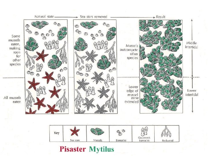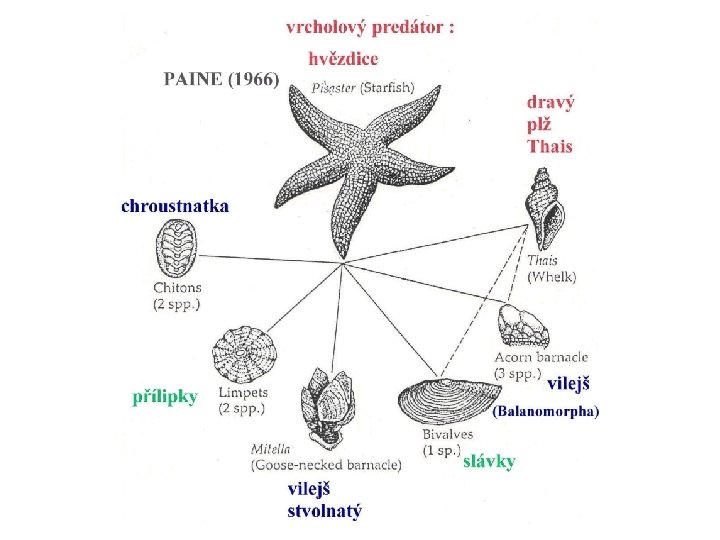 Selektivní role predace • R. T. Paine (1966 a j. ) na skalnatých mořských pobřežích v přílivové zóně testoval hypotézu, že v tropech je více predace • pokusně odstranil dravé hvězdice Pisaster • zjistil zásadní změnu druhového složení společenstva: - slávky osídlily i hlubší zonu - nakonec kompeticí vytlačily ostatní druhy • řídící role vrcholového predátora, dravé hvězdice Pisaster