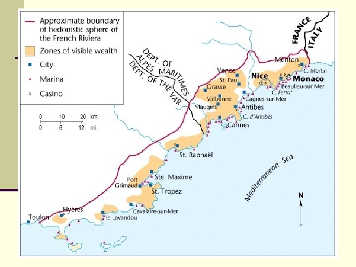 Elitist landscapes n Example of the French Riviera n n n n A district of stunning natural beauty and idyllic climate French elite created an aesthetically pleasing cultural landscape Characterized by preservation of old buildings and town cores Building codes and height restrictions are rigorously enforced Land values have risen making the Riviera ever more elitist It is now far removed from the folk culture and poverty that prevailed there before 1850 Farmers and fishermen have almost disappeared from the region