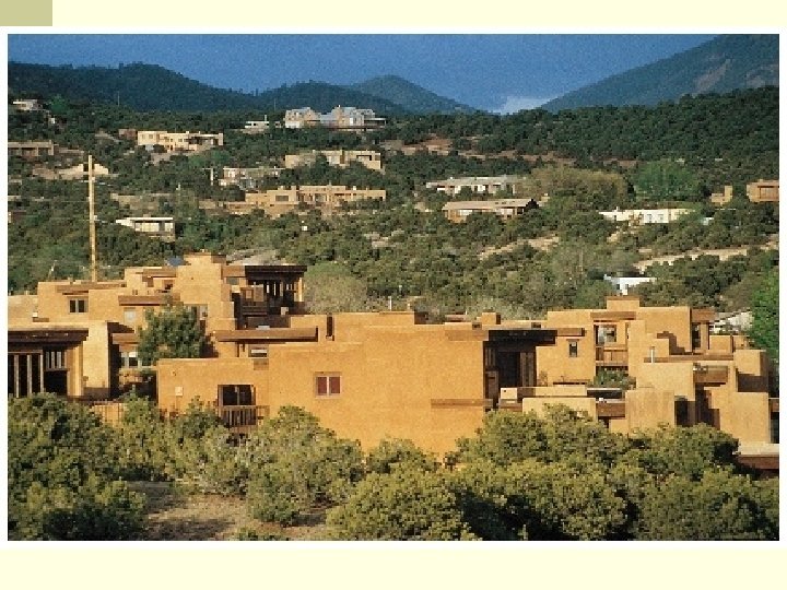 Elitist landscapes n America also has its elitist landscapes n Exclusive suburbs with rigidly enforced architectural themes are common n In Santa Fe the favored architectural style is pseudo Pueblo Indian