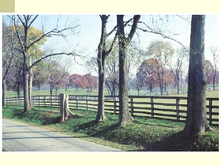 Elitist landscapes n Gentleman farms in the Kentucky Bluegrass Basin n n n Concentrations so great they constitute a dominant feature on the land scape Have black or white wooden fences A rural landscape created more for appearance than function Elaborate entrance gates with hand painted sign giving name of farm and owner Network of surfaced, well maintained driveways and pasture roads Elegant houses visible through a lawnlike parkland dotted with clumps of trees and maybe a pond or two Tourists think they are seeing the “real” rural America