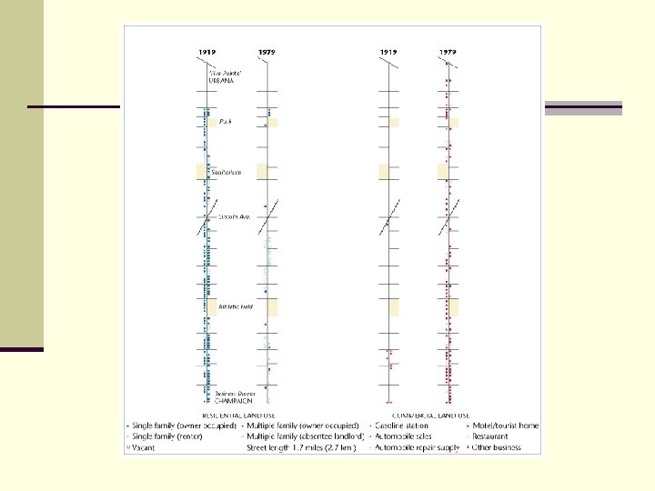 Landscapes of consumption n Eye catching commercial “strips” along urban arterial streets n Study of the evolution of such a strip in an Illinois college town Covered the period 1919 to 1979 n Street changed from single family residential to a commercial focus n