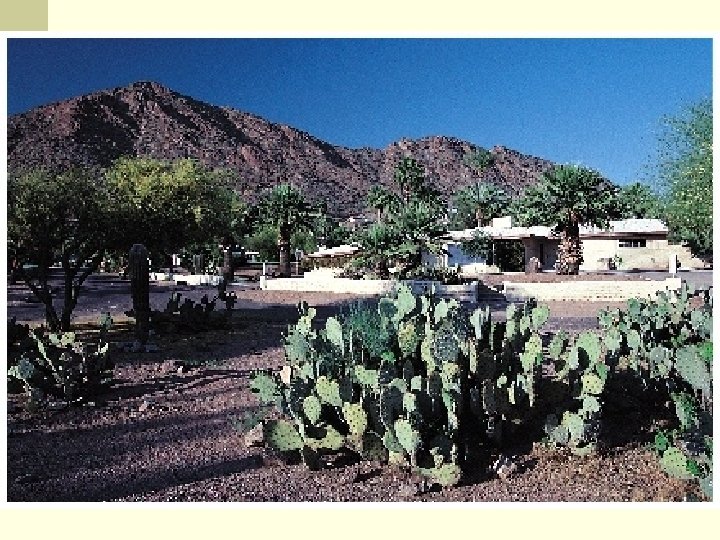 The American scene n The traditional American front yard n Decline of the grass front yard in favor of “desert front” yards n n n Began to rise in the 1950 s Gravel, crushed rock, desert plants, paving, or undisturbed desert Spurred by new urban immigrants who found the desert beautiful Acceptance occurred earliest in higher priced subdivisions Spread gradually to middle class districts
