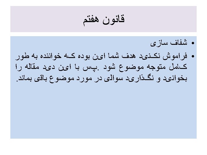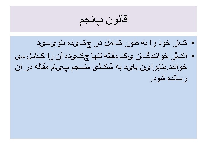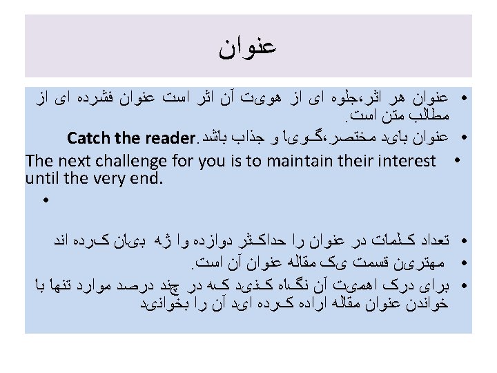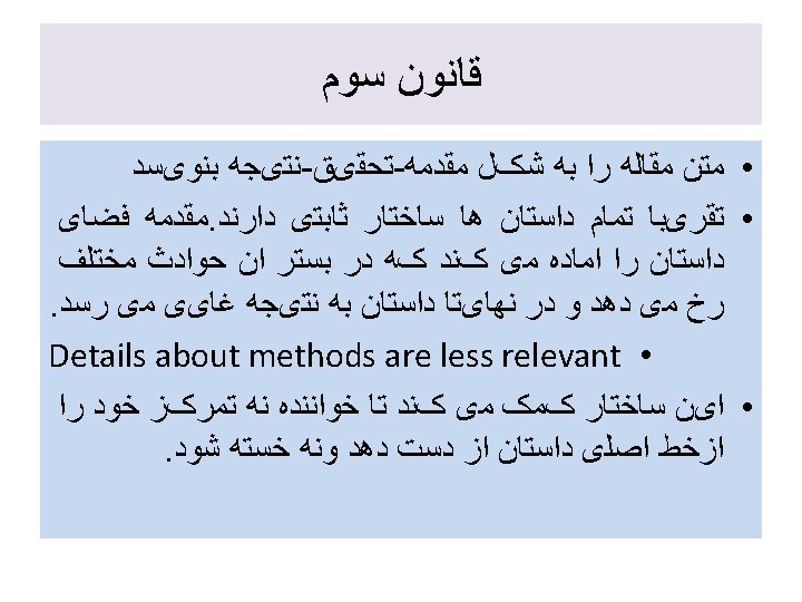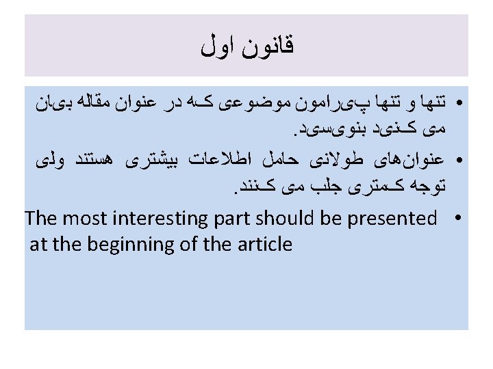 Cont… ü The most interesting part should be presented at the beginning of the article, not held back until the final sentence ü Help your readers understand what your results mean ü Explain what makes them interesting and how they might be used ü Details about methods are less relevant ü Instead of writing "This is an interesting result" your article should show what makes the result interesting