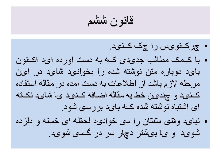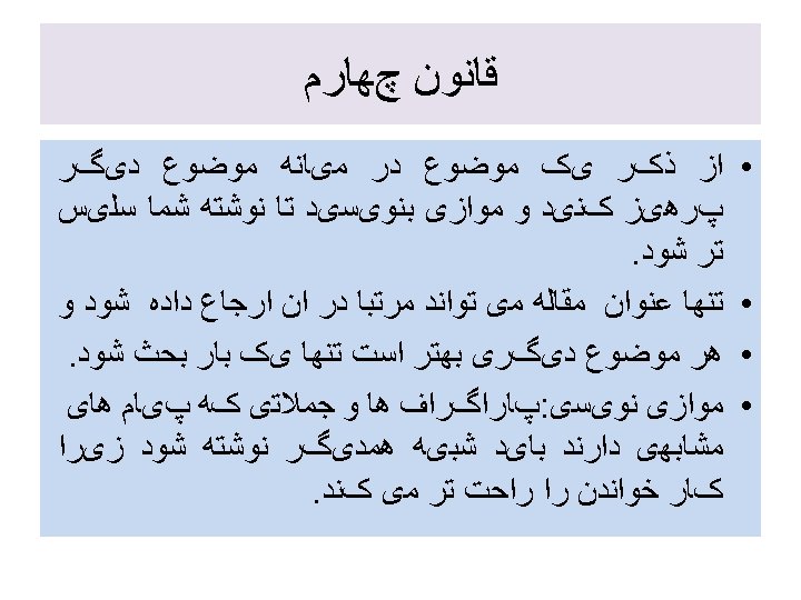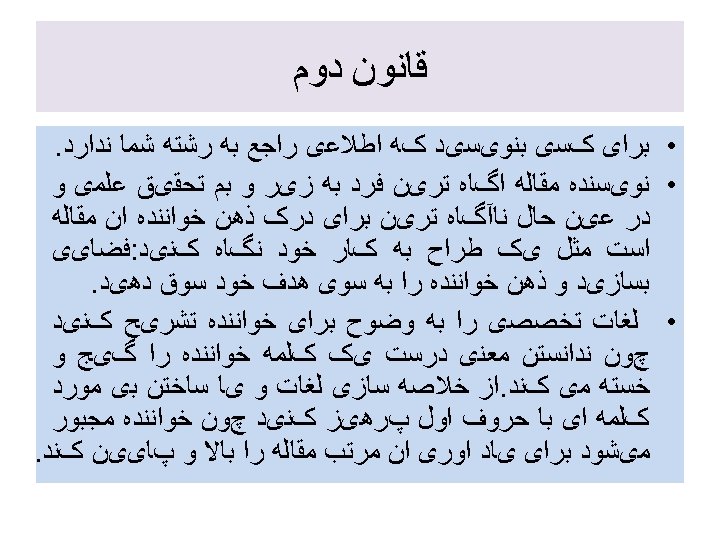 Cont… ü When describing your results, focus on what they mean and how they can be applied. ü Write an article that is easy to understand enjoyable to read. Use as few technical terms as possible, and avoid excessively long sentences. ü Ask a friend (who is not an expert in your field) to read and give honest comments on the first draft. ü Also ask your friend to correct the language. Rewrite and ask for new comments.
