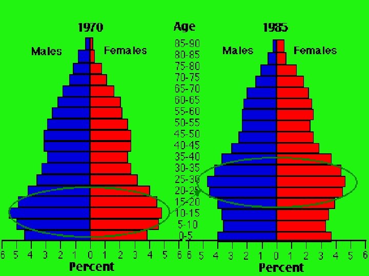 Patterns of Population Growth • Demographic Transition- dramatic change in birth and death rates. • What do you think the trend is now with birth and death rates? • Age-structure diagrams- graph number of people in different age groups in the population. • What event is shown in the next agestructure diagram?