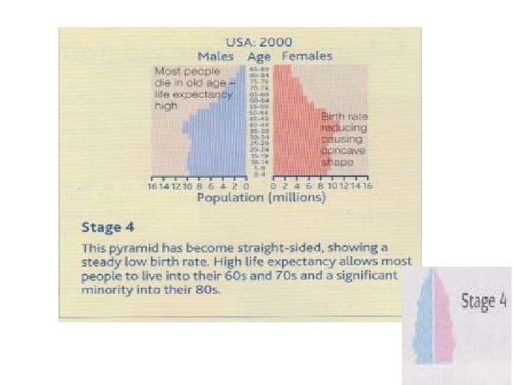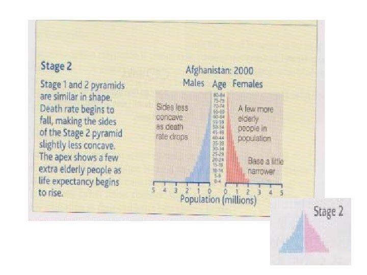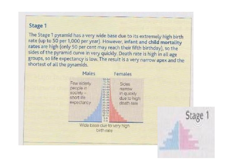 Pyramid for Ethiopia- Stage 2 The pyramid for Ethiopia displays many of the Characteristic features of a less economically developed country, particularly the wide base showing a population structure dominated by young people, due to high birth rates. The graph has an almost perfect pyramid shape, progressively tapering towards a narrow top, with few people above the age of 65. Pyramid for UK- Stage 4 The pyramid for the UK is taller and the top is more pronounced, showing significant numbers above the age of 65. The UK’s birth rate is low and the narrow base shows this. It is the middleaged groups that are dominant in pyramids for developed countries. Population pyramids for developing countries are wider at the base, narrower at the top and less tall than those for developed countries.