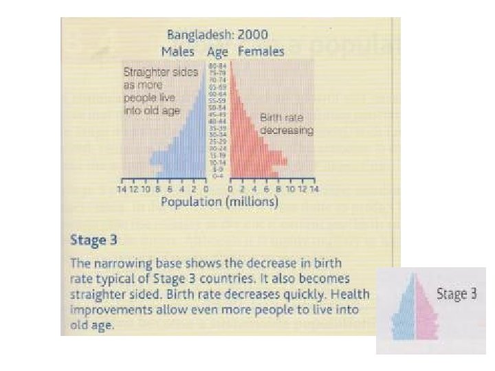 The demographic transition model (DTM) High fluctuating Early expanding Late expanding Low fluctuating Decline Birth rate Natural decrease in population ( BR< DR) Natural increase in population Total population (BR> DR) Death rate Low Stage 3 (late expanding)- birth rate declines rapidly while death rate falls slowly. Population growth slows down. Reasons for falling birth rate include: Egypt is in Stage 3 along with India, Kenya and Brazil- most countries at lesser stages of development. - Fewer people are farmers who need children to work - Birth control is now available - Number of infant deaths are falling - Women are staying in education longer and marrying later Death rate still falling- for the same reasons as in stage 2