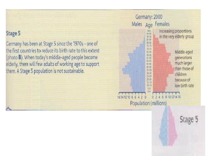 The demographic transition model (DTM) High fluctuating Early expanding Late expanding Low fluctuating Decline Birth rate Natural decrease in population ( BR< DR) Natural increase in population Total population (BR> DR) Death rate Low Stage 5 (natural decrease)- a later period, during which the birth rate is very low and goes below the death rate Reasons for the low birth rate: • a rise in individualism, linked to emancipation of women in the labour market Only recognised in recent years in some western European countries and highly developed rich ones e. g. Japan, Italy, Germany. • greater financial independence of women • concern about the impact of increased population numbers on resources for future generations • a rise in the concept of childlessness, as they are expensive to raise and many people have elderly dependents so have no kids