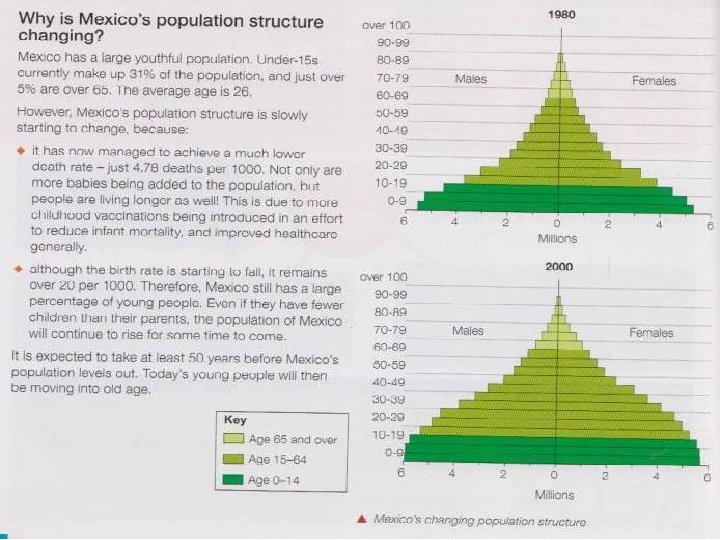 Look at the two population pyramids for Mexico. 1) Describe each pyramid’s shape 2) Explain the changes between 1980 and 2000.