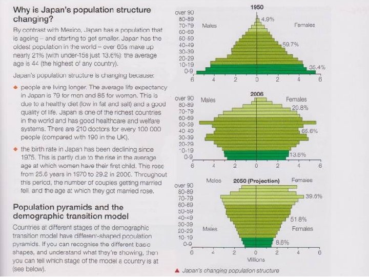 Mexico’s population pyramid for 1980: • Shows a large, youthful population aged 0 -15 • Shows a modest-sized, middle aged population aged 16 -64 • Shows a small, elderly population aged 65 and over- for both males and females • Has a slightly concave pyramid shape Mexico’s population pyramid for 2000: • Shows a large youthful population, with more people surviving into the 5 -15 year age range • Shows a ‘thickening’ of the pyramid in the middle age ranges • Shows some increase in the number of elderly people- particularly females • Has an almost perfect pyramid shape The main reason for the differences between these two pyramids is Mexico’s reduced death rate. More babies are surviving and its people are living longer- due to improved levels of health care and the increasing vaccination of infants.