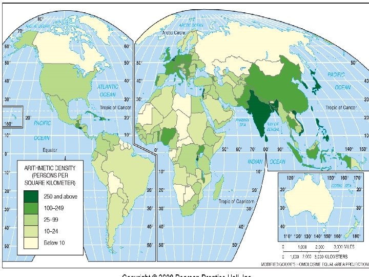 Population Density Aka arithmetic density- total # of people divide by total land area Used to compare countries because the info. for computing is easy to obtain About 80 per sq. mile in US (31 per sq. kilometer) Bangladesh= 2700 per sq. mile (many people, small land) India= 900 (more people than US, less land) Canada= 8 (big land, few people) Manhattan island-68, 000