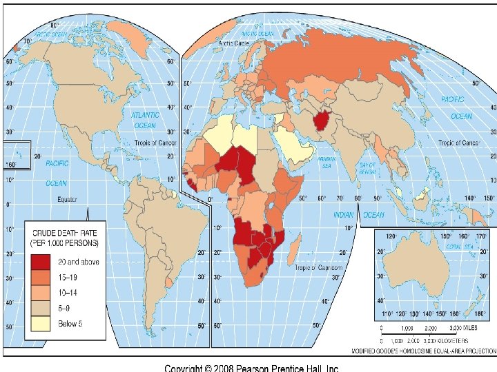Mortality Infant mortality rate (IMR)- the annual # of deaths of infants under 1 year of age, compared with total live births Per 1000 births Very high in Africa, very low in Europe A reflection of the country’s health care system US has a higher IMR than Canada and Europe – Many poor in US can’t afford health care