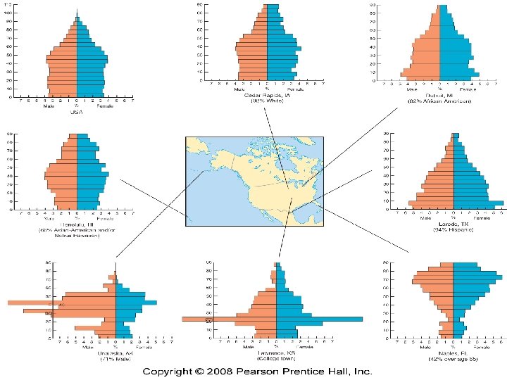 Population Pyramids The stage of demographic transition gives a country a distinctive population structure Demographic transition effects the structure in 2 ways 1. 2. % of population in each age group Distribution of males and females