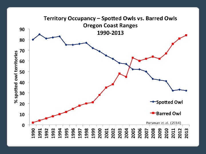 Northern Spotted Owl – Current Status: 1990 -2008 Area Fecundity Survival λRJS Population change CLE Stable Declining 0. 937 Declining RAI Increasing Declining 0. 929 Declining OLY Stable Declining 0. 957 Declining COA Increasing Declining since 1988 0. 966 Declining HJA Increasing Declining 0. 977 Declining TYE Stable Declining since 2000 0. 996 Stationary KLA Declining Stable 0. 990 Stationary CAS Declining since 2000 0. 982 Stationary NWC Declining 0. 983 Declining HUP Stable Declining since 2004 0. 989 Stationary GDR Declining 0. 972 Declining Forsman et al. (2011).