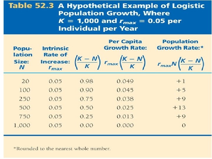 • The logistic growth equation – Includes K, the carrying capacity, the largest number of individuals of a population that an environment can support d. N dt rmax N (K N ) K