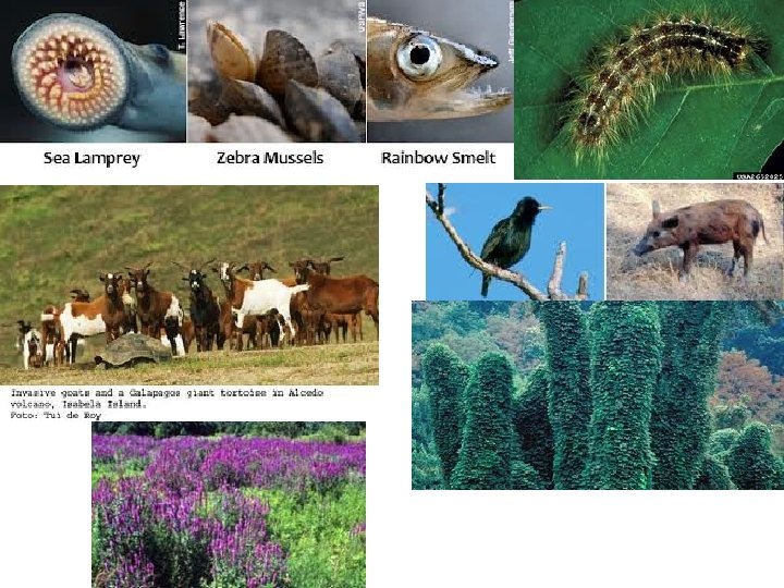 Importation of Nonnative Organisms: – Transfers organisms into communities where they normally don’t exist – Factors that would naturally limit it’s population growth (predators, parasites) may not exist in the new environment so population explodes – This may displace other species through competition for resources and disrupt the existing ecosystem. – Ex: – Starlings, goats, cats, pigs, japanese beetles, gypsy moths, boxer crabs, zebra mussels, mugwort, purple loosestrife, kudzu
