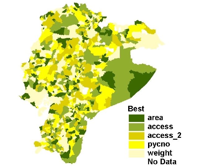 Modeled population counts compared to census data for Peru and Ecuador verification data sets: percentage differences PERU Variable N Mean Minimum Maximum CV Sum ------------------------------------DAREA 1781 196. 40 0. 13 16741. 92 371. 72 349797. 39 DPYCNO 1781 190. 89 0. 17 20361. 68 378. 29 339991. 89 DACCESS 1781 168. 63 0. 04 17139. 46 381. 31 300337. 16 DACCESS_2 1781 160. 16 0. 02 15857. 71 352. 97 285248. 06 DWEIGHT 1781 148. 56 0. 02 11166. 89 338. 47 264588. 71 ECUADOR Variable N Mean Minimum Maximum CV Sum -----------------------------------DAREA DPYCNO DACCESS_2 DWEIGHT 918 918 918 235. 06 235. 38 176. 95 178. 11 154. 62 0. 01 0. 20 0. 12 0. 22 0. 59 17803. 46 16337. 44 5001. 63 4116. 35 5022. 37 354. 12 342. 67 248. 19 233. 95 235. 05 215788. 54 216080. 66 162441. 51 163508. 02 141944. 20